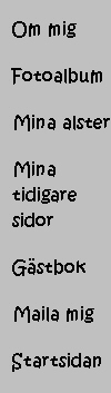Lite information om vem jag är Mina fotoalbum Teckningar m m som jag gjort Mina tidigare hemsidor Skriv gärna en rad i min gästbok Skicka ett mail Tillbaka till startsidan